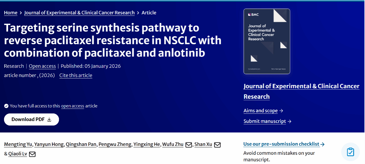 近日,药学院、药物分子设计与评价江西省重点实验室郑鹏武教授团队徐珊教授联合江西省肿瘤医院在国际医学权威期刊《Journal of Experimental & Clinical Cancer Research》(中国科学院医学-肿瘤学一区TOP期刊,IF=12.8)上发表了题为“Targeting serine synthesis pathway to reverse paclitaxel resistance in NSCLC with combination of paclitaxel and anlotinib”的研究论文。论文第一作者为药学院2022级硕士研究生余梦婷,通讯作者为徐珊教授与江西省肿瘤医院吕巧莉教授。
