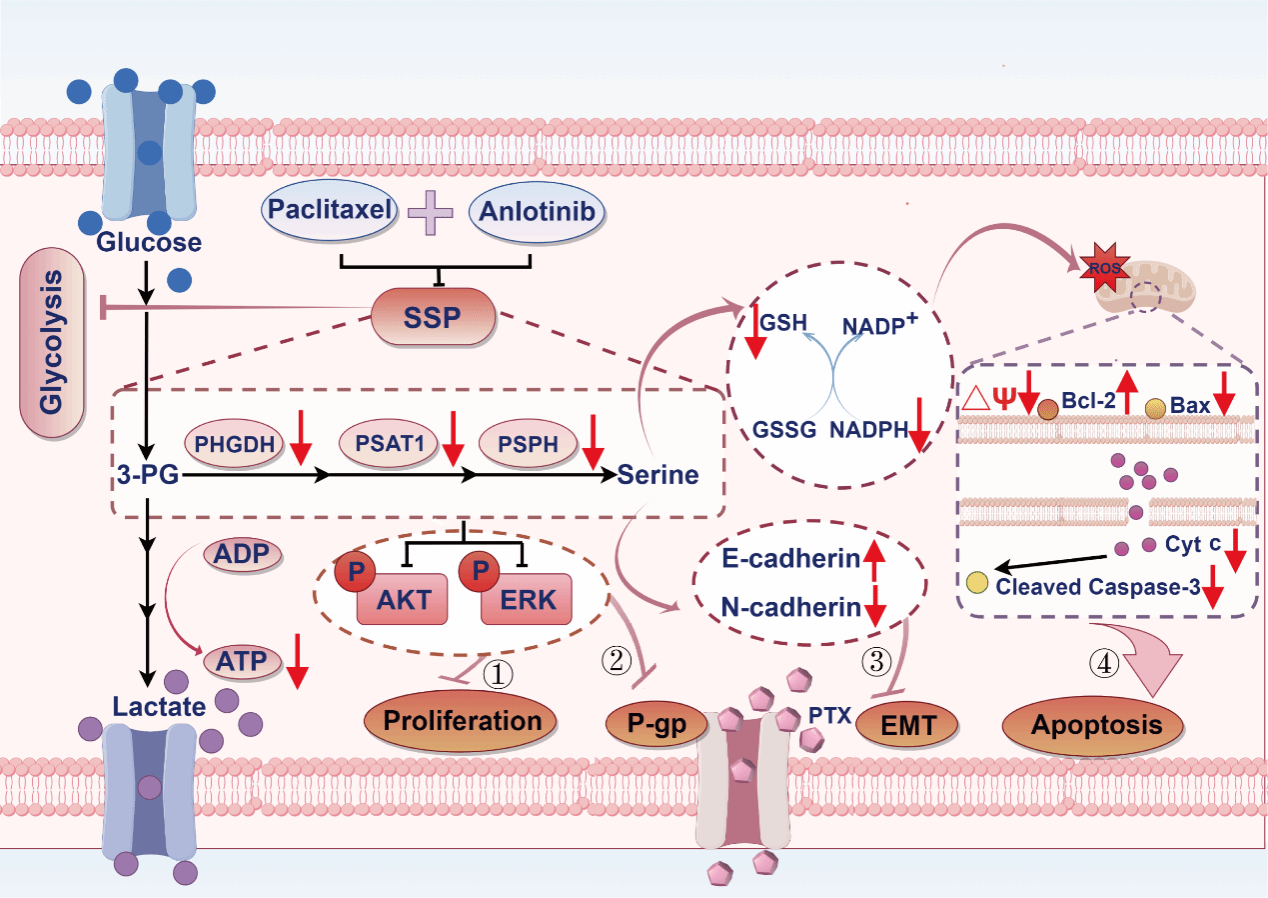 紫杉醇(PTX)是治疗晚期非小细胞肺癌(NSCLC)的一线化疗药物,然而耐药性的最终发展严重危害患者的生命健康。丝氨酸合成途径(SSP)与多种类型癌症的耐药性相关,并在NSCLC中激活,但其与PTX耐药的关系尚不清楚。在这项研究中,作者发现激活的SSP是NSCLC PTX耐药的关键驱动因素,增强的SSP有助于PTX耐药的NSCLC细胞增殖、P-gp蛋白表达及转运功能、诱导EMT以及氧化还原稳态的维持。安罗替尼与紫杉醇对PTX耐药的NSCLC细胞具有协同治疗效果,两药联用能够显著抑制SSP致使糖酵解能力减弱、AKT/ERK增殖信号通路传导受损、抑制P-gp蛋白表达及转运功能并逆转EMT进程,以及氧化还原稳态失衡导致ROS增多进而激活线粒体凋亡通路最终诱导细胞凋亡。总之,研究结果表明通过联用安罗替尼与紫杉醇抑制SSP是治疗NSCLC PTX耐药的有效治疗策略,为临床治疗非小细胞肺癌提供了新思路。