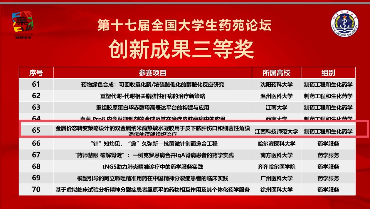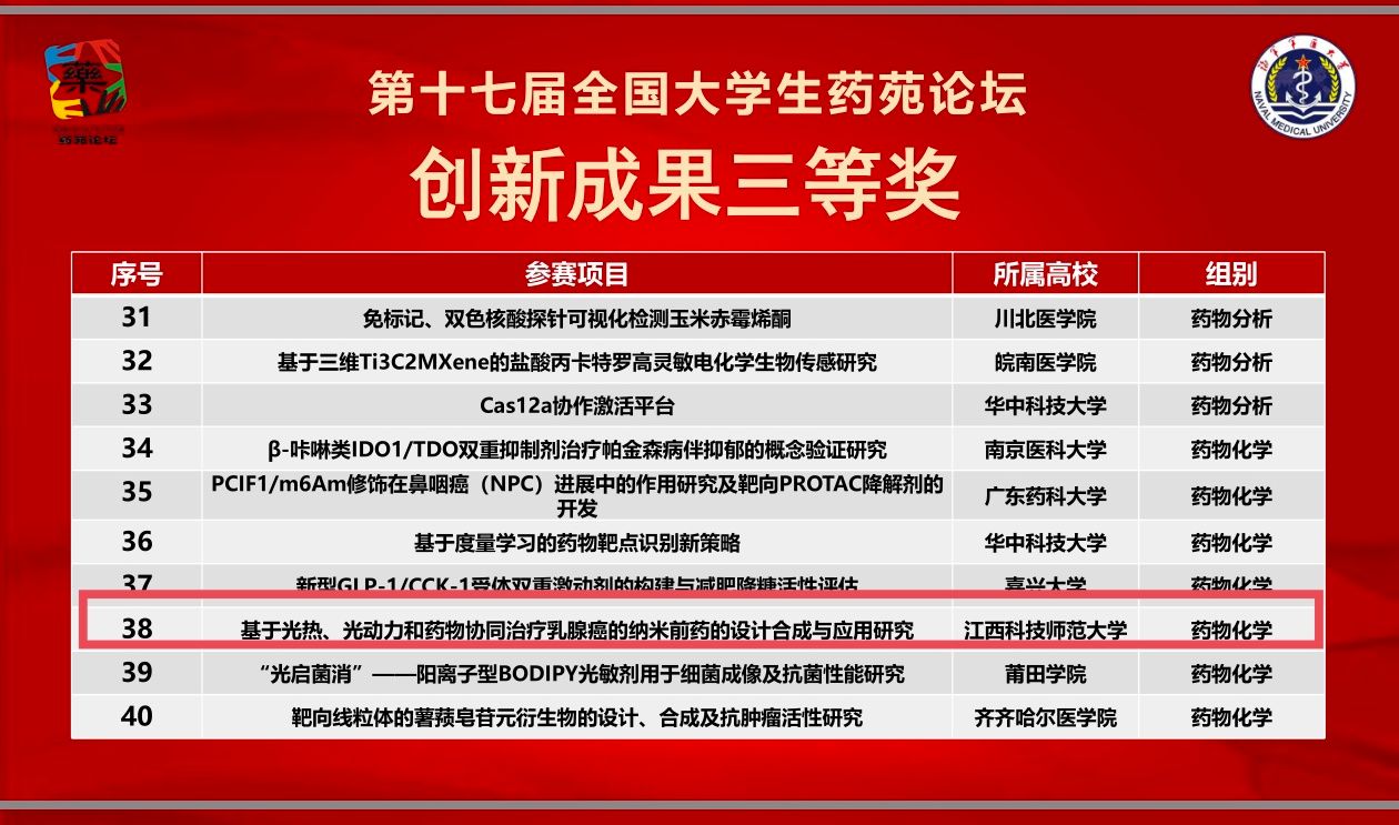 项目《基于光热、光动力和药物协同治疗乳腺癌的纳米前药的设计合成与应用研究》由周莹怡等同学完成,乔丹、张瑾征老师指导。该研究融合三重治疗机制,为乳腺癌精准治疗提供新思路。项目《金属价态转变策略设计的双金属纳米酶热敏水凝胶用于深部组织感染治疗》由李娴晰、潘杰仪、李仁熙等同学完成,聂存鹏、潘青山、徐珊老师指导。该研究成果有望应用于皮下脓肿、细菌性角膜溃疡等难治性感染治疗。两项成果充分展现了我校药学专业学生扎实的科研素养与创新能力,彰显了团队面向临床需求、服务健康中国的责任担当。