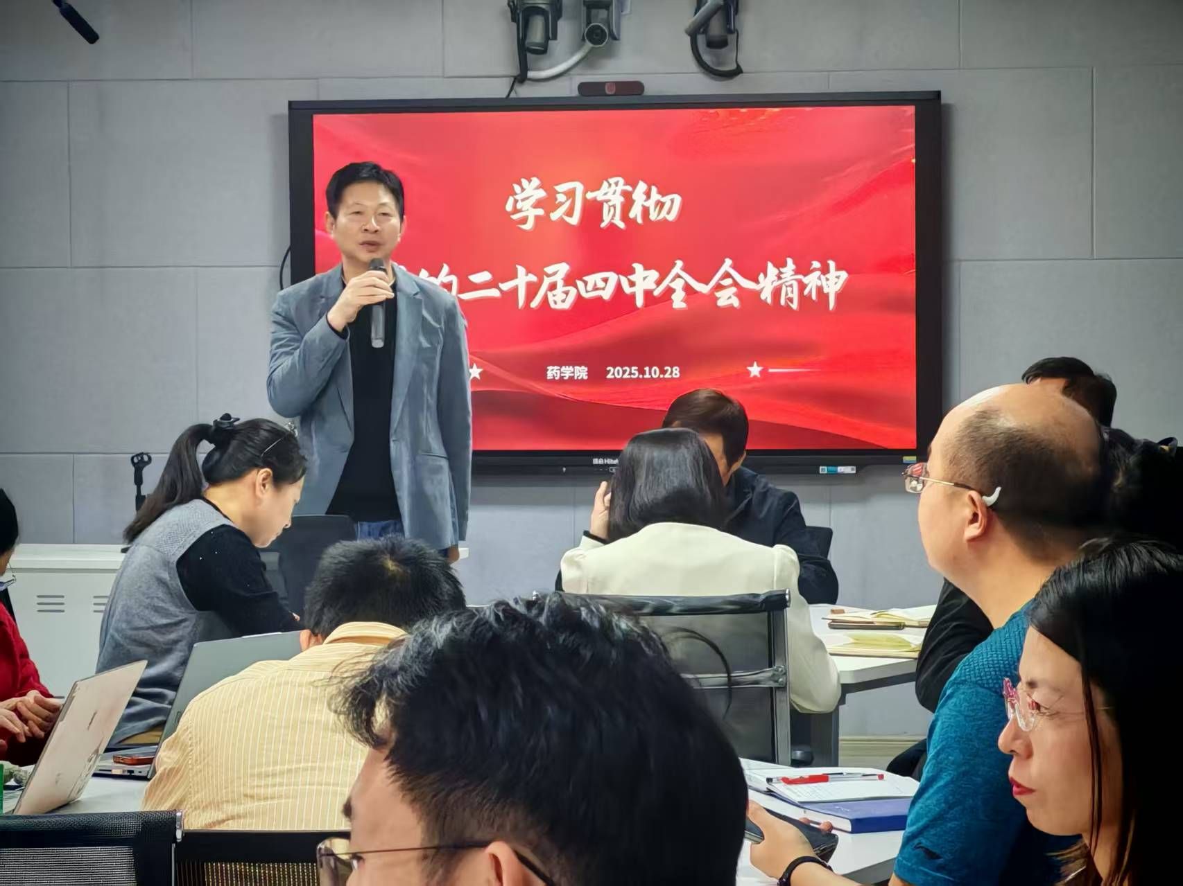 10月28日下午14:00,药学院党委于枫林校区药学实验楼Y201会议室召开专题会议,深入学习贯彻党的二十届四中全会精神,会议由药学院党委书记李立民主持,药学院全体教职工参与会议。