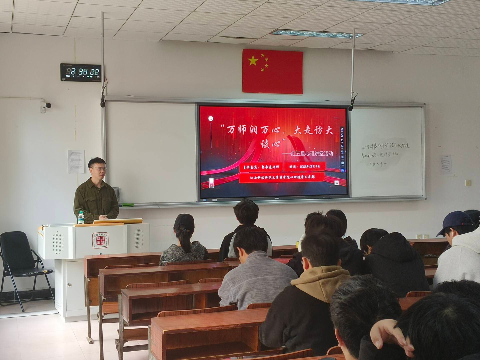 郭永亮以“情绪的本质与价值”为切入点,结合常见的学业压力、工作负荷、人际关系困扰等场景,系统讲解了情绪识别、压力评估、自我调节的核心方法,通过鲜活的案例分析、实用的心理测试工具,深入浅出地阐释了认知重构、正念放松、合理宣泄等情绪管理技巧,现场演示了简单易操作的压力缓解方法,引导同学们正确看待情绪、科学调控情绪。