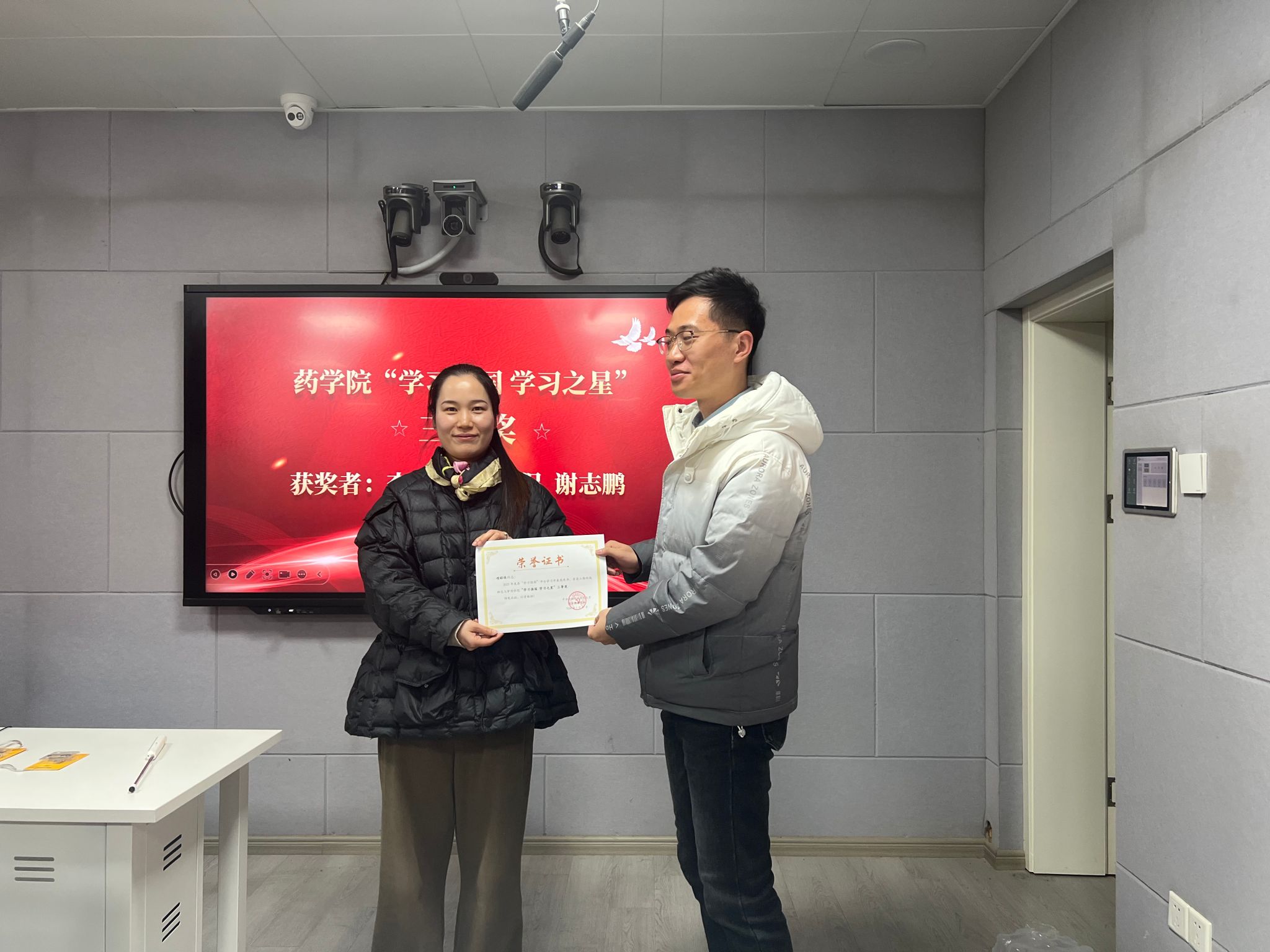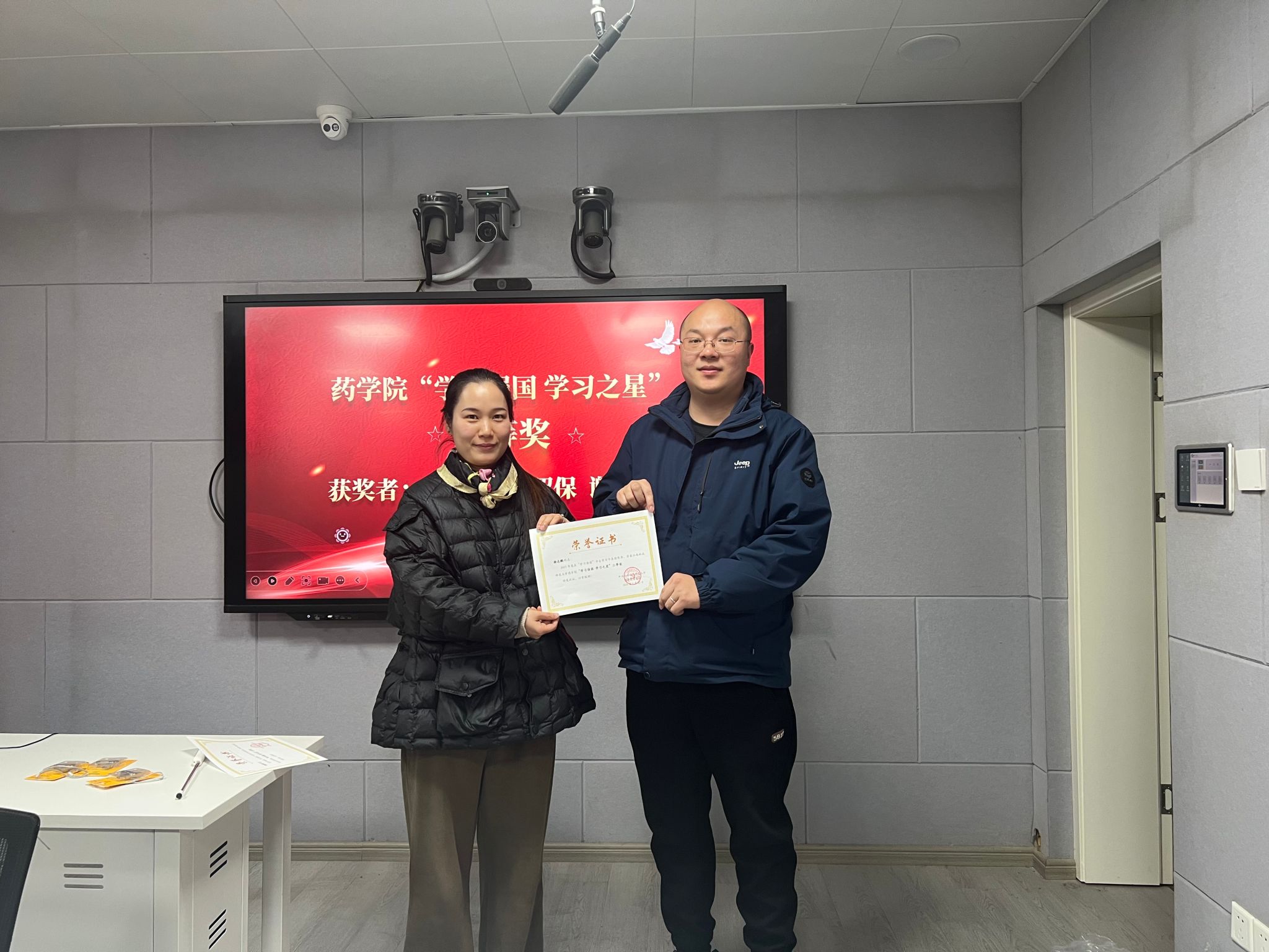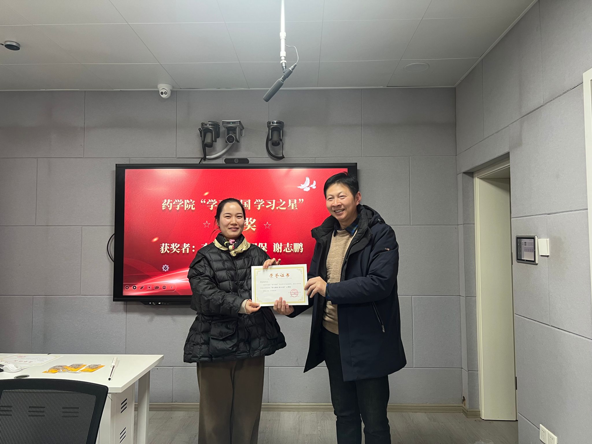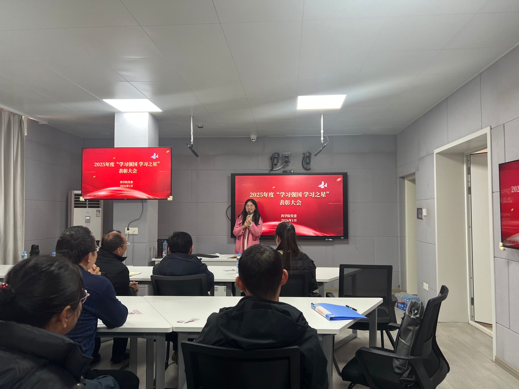 为深入学习贯彻习近平新时代中国特色社会主义思想,全面落实党的二十届四中全会精神,进一步推动“学习强国”学习平台学用工作走深走实,厚植全院崇尚学习、以学促干的浓厚氛围,充分发挥先进典型的示范引领作用,1月23日,药学院教工党支部隆重召开2025年度“学习强国·学习之星”颁奖表彰会,对在平台学习中表现突出的党员同志予以表彰。本次活动由教工党支部书记徐珊主持,支部全体党员参加。