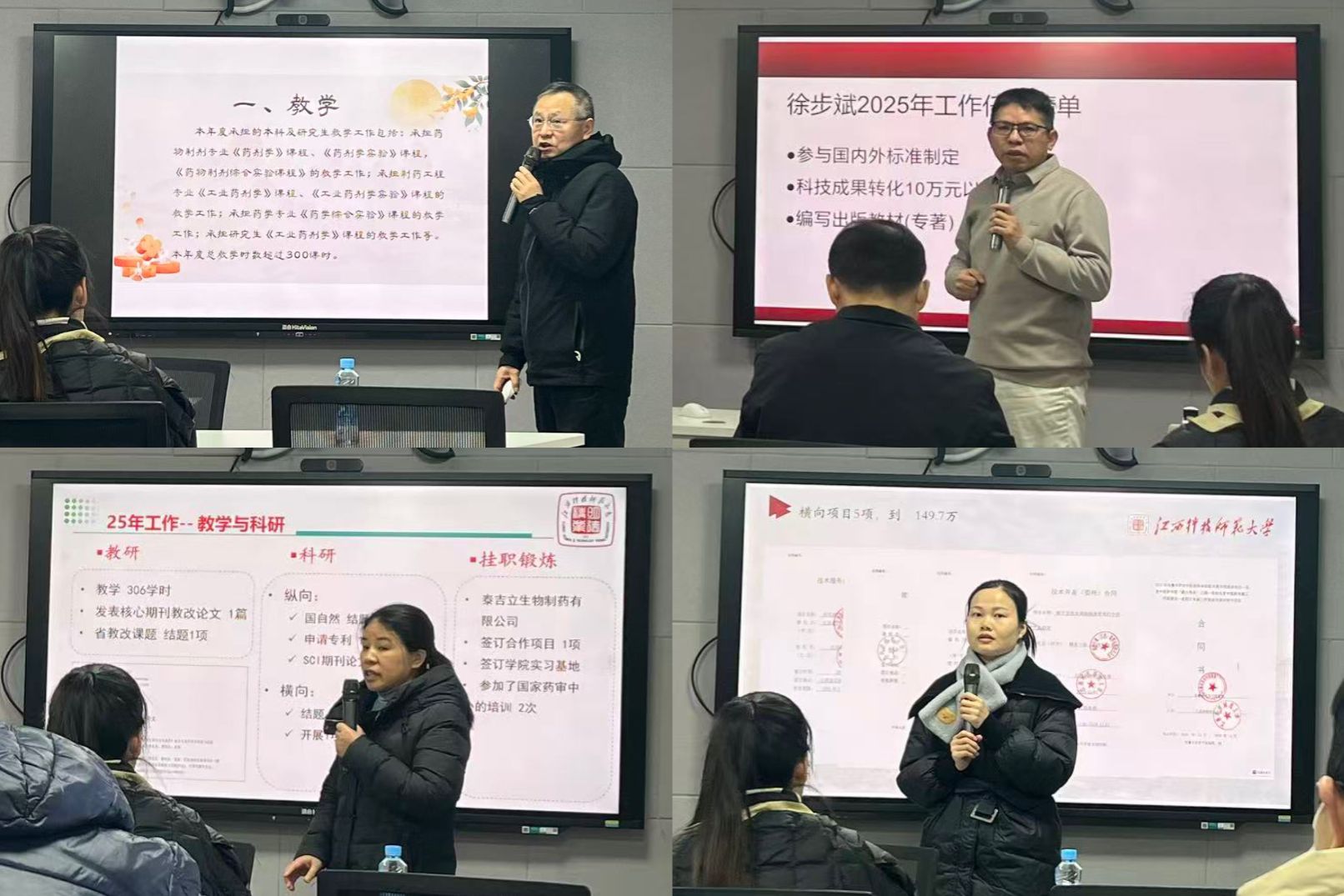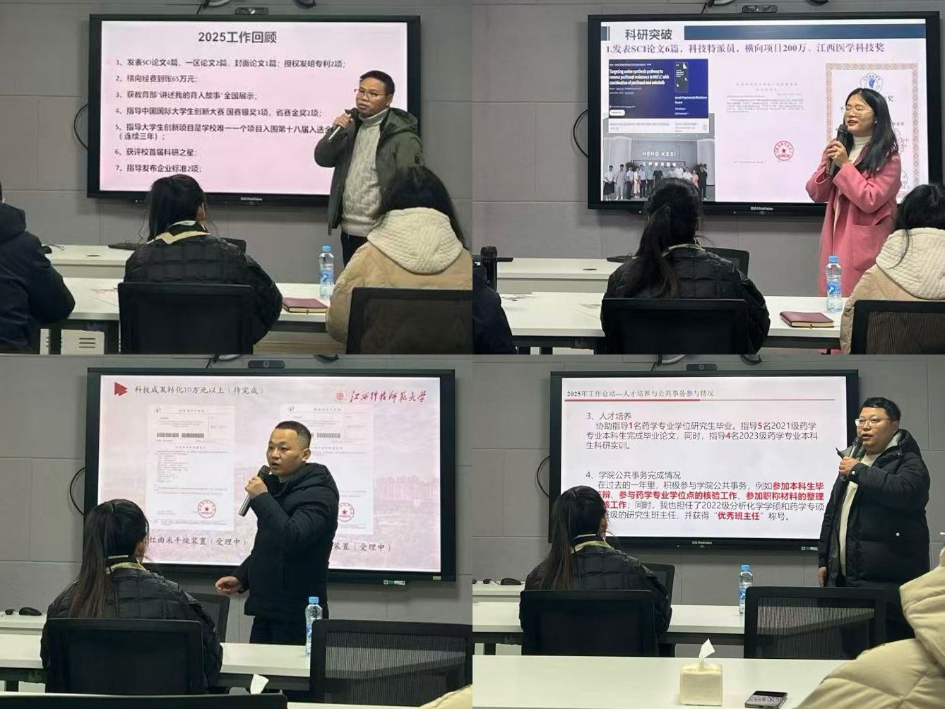 会上,教职工逐一登台,围绕教学改革、科研创新、社会服务、师德师风等方面晒出“成绩单”,剖析了2025年初认领任务完成情况、存在差距及深层原因,为2026年工作提质增效、靶向发力奠定坚实基础;重点分享了课程建设、学生培养、教学方法创新等方面的实践举措与成效,详细汇报了科研论文发表、纵横向课题申报与结题、成果转化等领域的突破进展;并对2026年工作进行了系统谋划与全面部署,明确了工作目标。