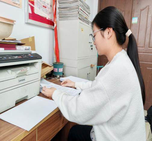 此外,她还承担资料规范誊抄任务。为保证内容准确、格式统一,她先研读原文明确要求,再逐字逐句誊抄,遇模糊内容及时请教。虽伏案书写辛苦,但看到字迹工整、格式规范的成果时,成就感油然而生,也学会了“沉心做好小事”的工作态度。