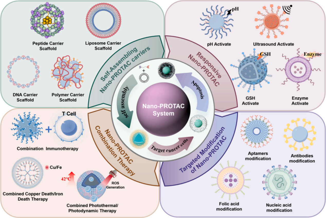 在现代生物医药领域,蛋白降解靶向嵌合体(PROTAC)技术凭借其独特的“降解而非抑制”机制,为靶向传统“不可成药”靶点和克服耐药性带来了革命性契机。然而,由于PROTAC分子通常具有较大的分子量和复杂的结构,其在临床转化过程中面临着水溶性差、口服生物利用度低、膜渗透性不足以及非特异性分布导致的脱靶毒性等严重挑战。本综述系统剖析自组装、刺激响应、主动靶向及组合型四大纳米PROTACs模块化平台,围绕各平台的设计原理、作用机制、临床前药效与现存挑战展开论述,同时梳理该技术在癌症、神经退行性疾病、自身免疫性疾病精准治疗中的转化路径。综述核心亮点在于:全面梳理纳米PROTAC技术发展脉络,系统凝练四大关键技术模块,融合多学科研究思路,拓展其多疾病应用场景,为领域内后续研究及临床转化提供重要参考。