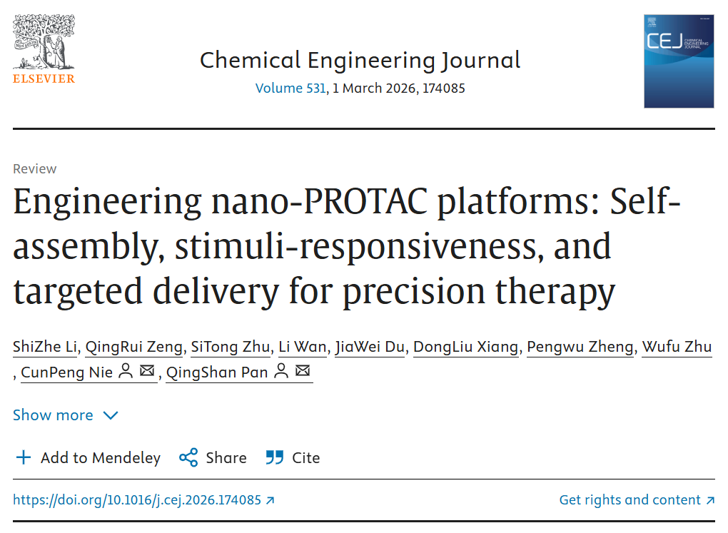 近日,我校药学院、药物分子设计与评价省重点实验室郑鹏武课题组潘青山、聂存鹏博士在材料科学领域国际期刊《Chemical Engineering Journal》(中国科学院一区,IF=13.2)上发表题为“Engineering nano-PROTAC platforms: Self-assembly, stimuli-responsiveness, and targeted delivery for precision therapy”的最新综述论文。该文第一作者为我院2024级硕士研究生李世哲,通讯作者为潘青山副教授、聂存鹏博士。
