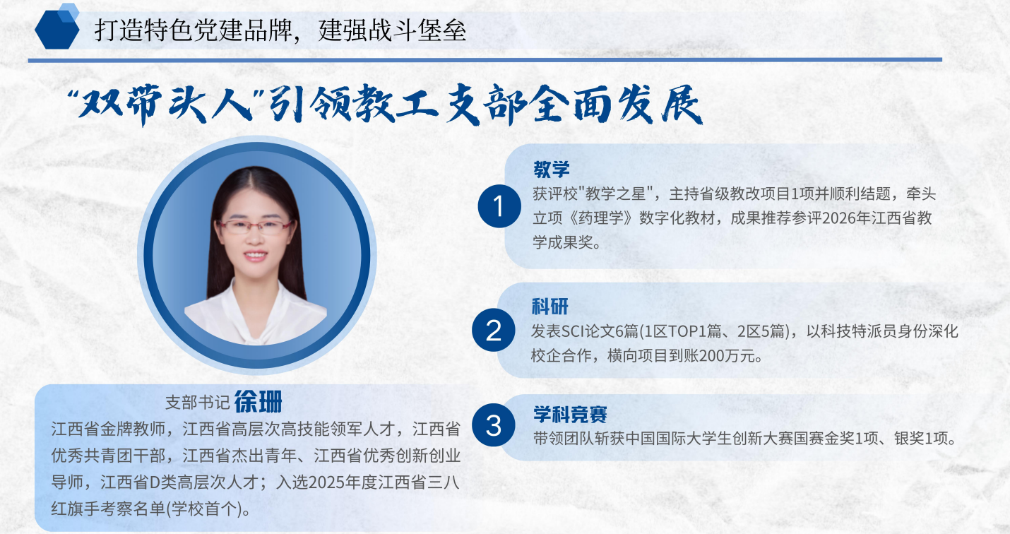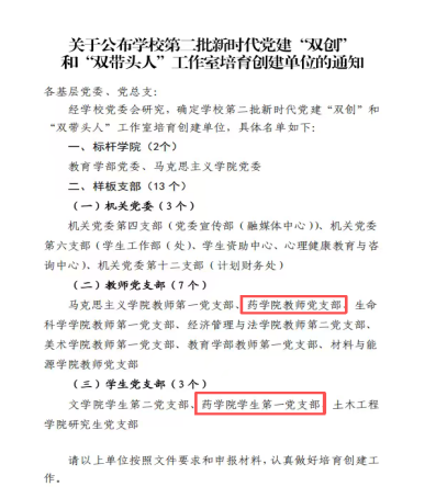 近日,江西省委教育工委公布了全省第二批党建工作示范高校、标杆院系、样板支部培育创建名单,药学院党委成功入选“全省第二批党建工作标杆院系”培育创建名单。校党委组织部此前也公布了校第二批新时代党建“双创”和“双带头人”工作室培育创建单位样板支部,药学院教师党支部、学生第一党支部双双入选,学院实现了党建“双创”工作的层级突破,是继学院党委获批校第一批新时代党建“标杆院系”培育单位后的又一重要成果。