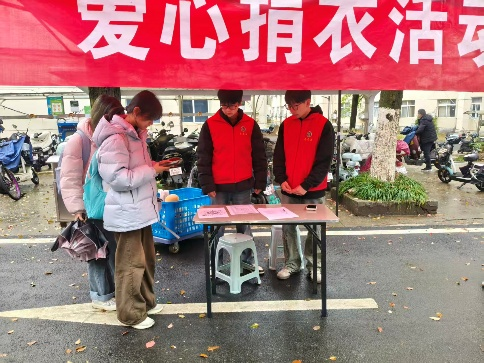 枫林校区食堂前,志愿者们设立专项站点,有序开展爱心衣物捐赠工作。大家热情接待前来捐赠的师生,将募捐而来的冬衣、薄衫分类整理、打包登记,并将衣物捐送给有需要的人们传递温暖与善意