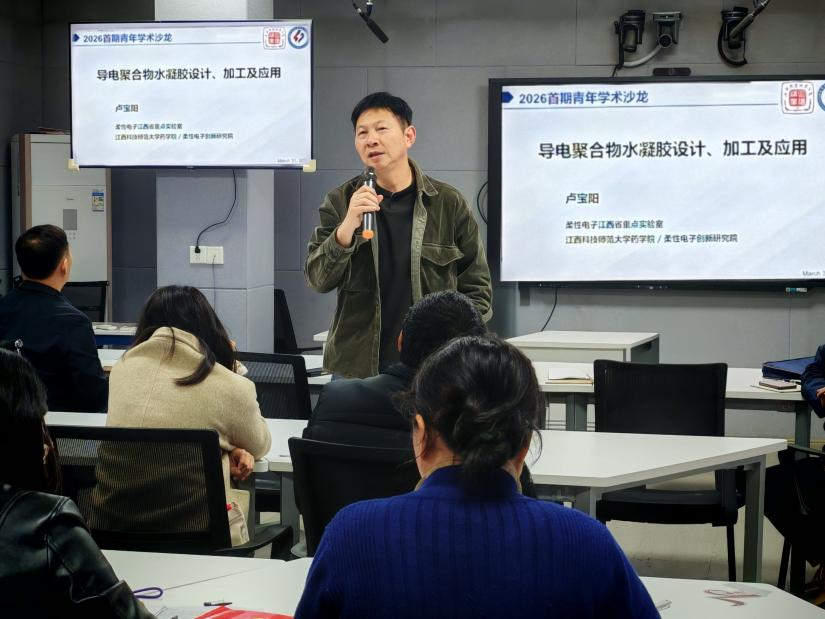 首次沙龙活动由青年长江学者、药学院院长卢宝阳教授主讲,他以《导电聚合物水凝胶设计、加工及应用》为主题展开深入分享。报告中,卢院长围绕导电聚合物水凝胶的研究现状,深入剖析了当前该领域在力电性能、加工制造、应用拓展等方面面临的挑战,并详细介绍了团队在高韧性导电水凝胶研发、高精度3D打印技术、生物电子界面及软体机器人应用等方向的创新解决方案与研究成果。内容兼具理论深度与实践价值,彰显了前沿交叉研究的学术价值与社会意义。